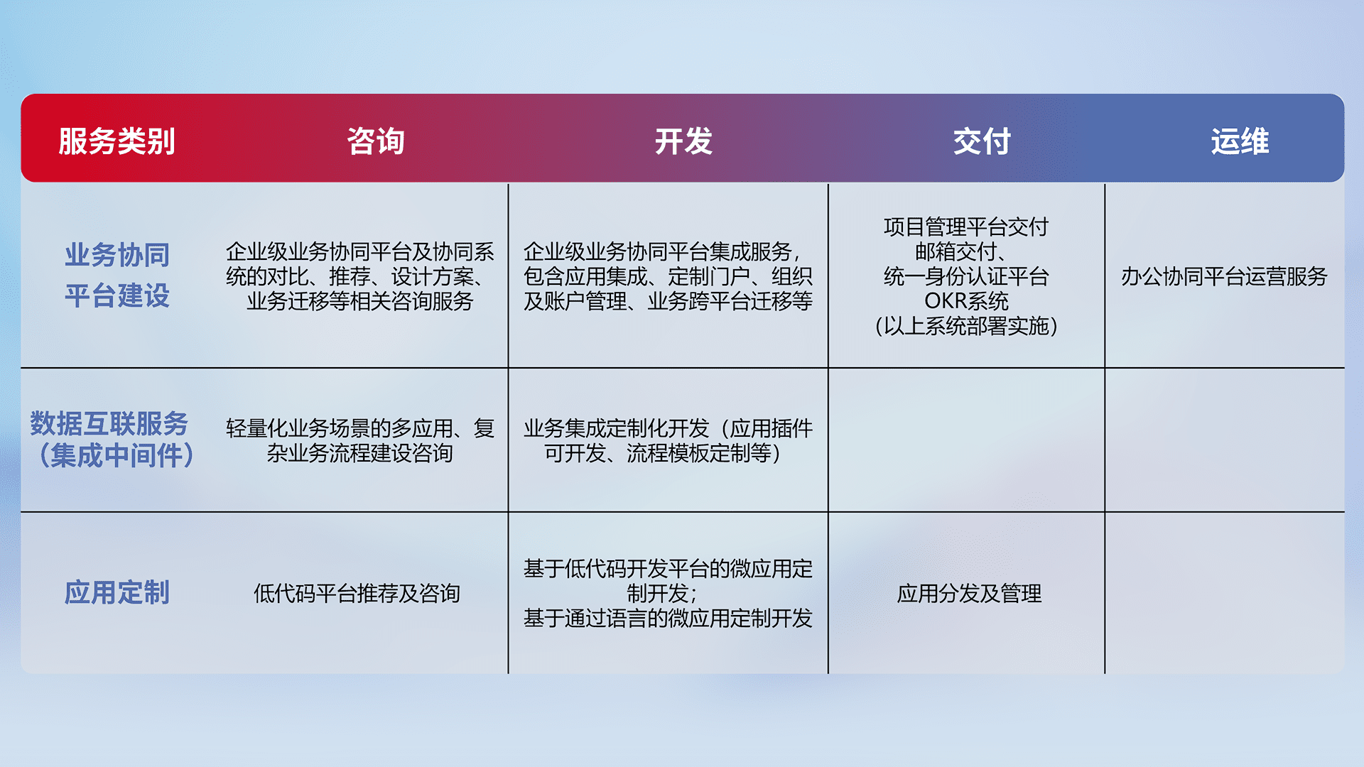 针对钉钉、、企微、、、、IDaas等平台级产品提供产品的规划、、方案、、、交付、、、、定制化开发等服务,,,实现如统一协同办公、、、、智能客户服务、、混合会议管理、、、智能数据查询、、等业务场景,,实现数字化转型。。。